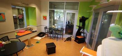 This boy isn’t at risk of being euthanized (at least for now). He’s one of the luckiest cats at the shelter because he’s housed in the “catfe”, a large area dedicated to promoting the adoption of adult cats. This area houses up to 5 adult cats, and potential adopters can hang out enjoy a free cup of coffee. Here’s a photo of the room. Behind the camera, there’s an adjoining area with a big window & window seat and the litter boxes.